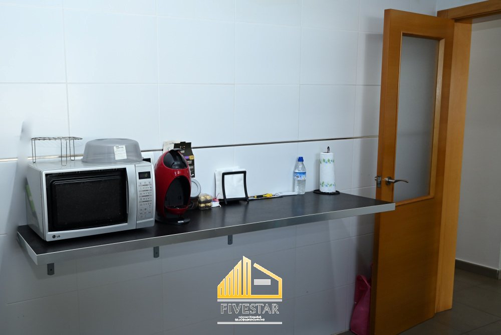 La moderna y amplia cocina cuenta con muebles de madera oscura, encimeras blancas y electrodomésticos de acero inoxidable, incluyendo horno y lavavajillas integrados.